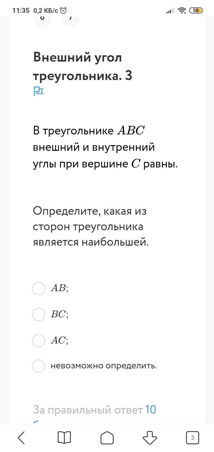 АB, так как треугольник - прямоугольный (внешний и внутренний углы равны) и получается, что угол С - 90 градусов, а как мы знаем против большего угла лежит большая сторона