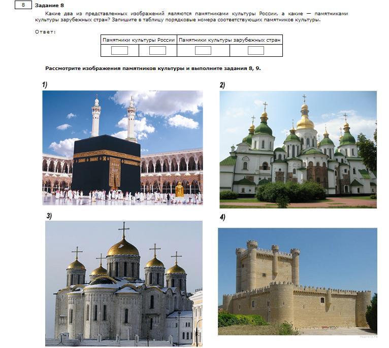 Какие два из представленных изображений являются памятниками культуры России, а какие — памятниками культуры зарубежных стран? Запишите в таблицу порядковые номера соответствующих памятников культуры.