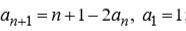 a_{n+1}+2a_n=n+1\ lambda+2=0=>lambda=-2=>a_{noo}=C(-2)^n\ a_{nr_H}=An+B=>A(n+1)+B+2An+2B=n+1=>3An+(A+3B)=n+1=>A=dfrac{1}{3}=>dfrac{1}{3}+3B=1=>B=dfrac{2}{9}=>a_{nr_H}=dfrac{1}{3}n+dfrac{2}{9}\ a_n=C(-2)^n+dfrac{1}{3}n+dfrac{2}{9}\ a_1=1=>1=C(-2)+dfrac{1}{3}+dfrac{2}{9}=>C=-dfrac{2}{9}\ a_n=dfrac{1}{9}(-2)^{n+1}+dfrac{1}{3}n+dfrac{2}{9}