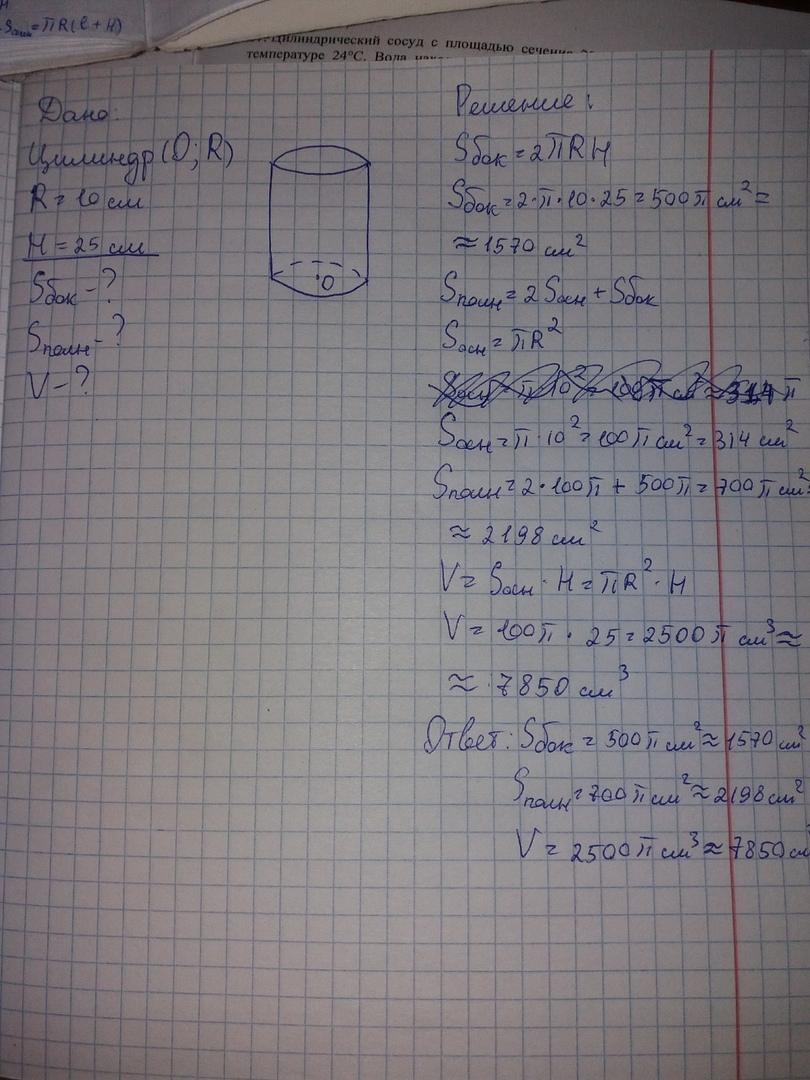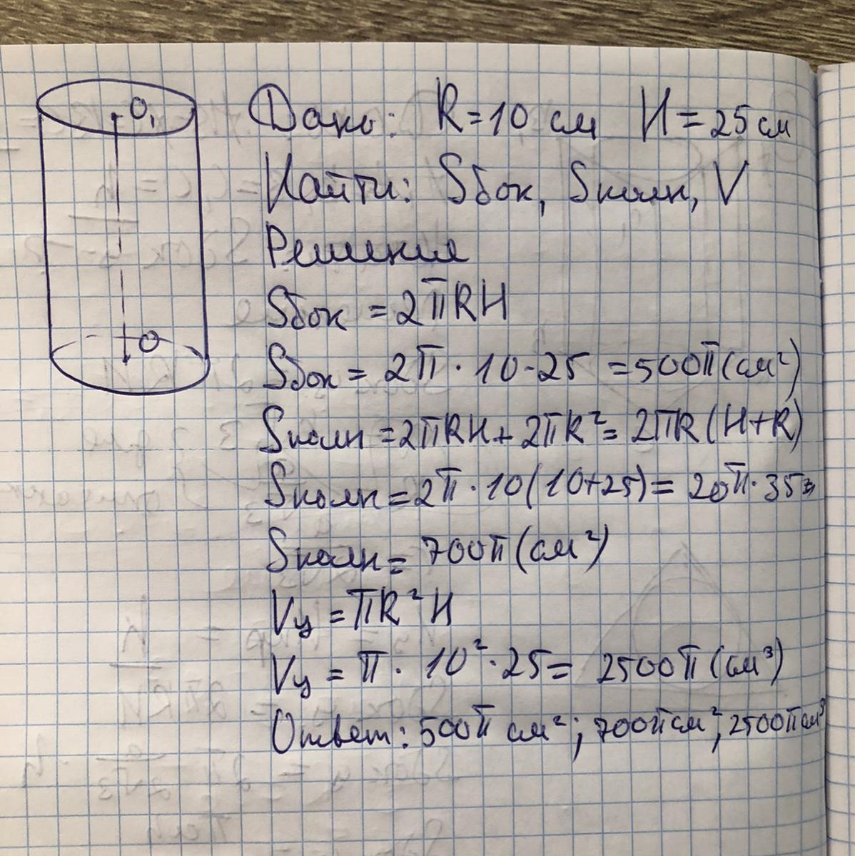 Sбок=500П см^2; Sполн=700П см^2; V= 2500П см^3