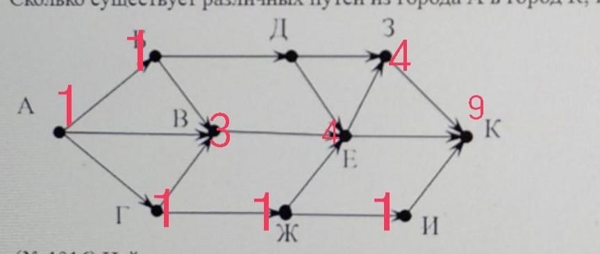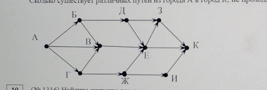 1) На рисунке- схема дорог, связывающих города А, Б, В, Г, Д, Е, Ж, З, И и К. По каждой дороге можно двигаться только в одном направлении, указанном стрелкой.
