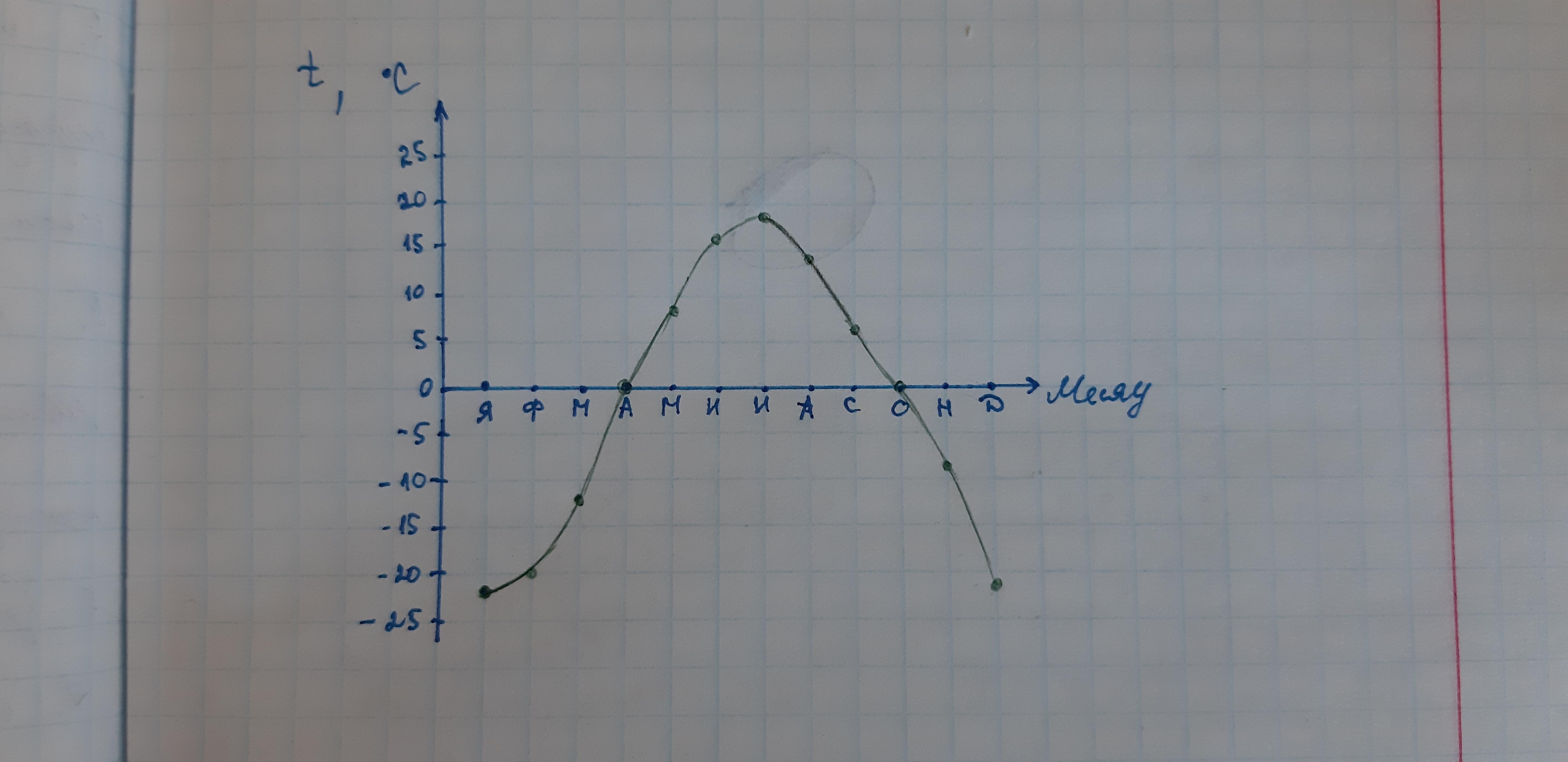 Всё начертила. По оси абсцисс- месяц, по оси ординат- температура
