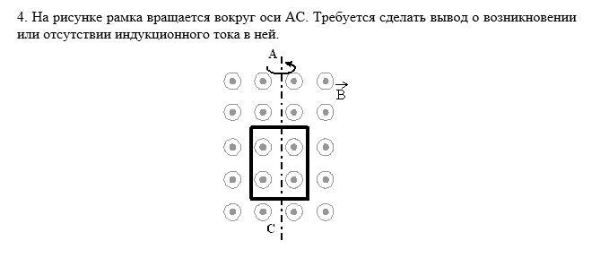 При вращении замкнутой рамки в магнитном поле магнитный поток ΔФ изменяется. В соответствии с законом электромагнитной индукции в рамке возникнет ЭДС индукции =- ΔФ/Δt, а поскольку рамка замкнута, будет индукционный ток.