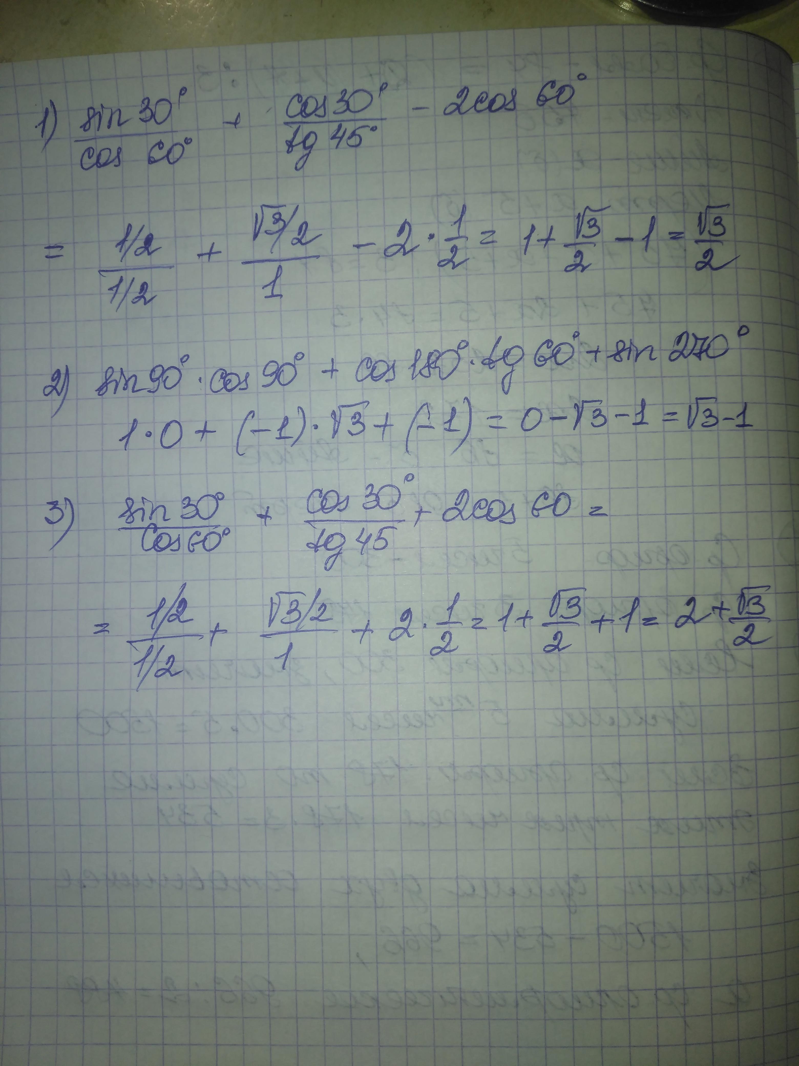 3) sin30° ( разделить на ) cos60° + cos 30° ( разделить на ) tan 45° + 2cos60°