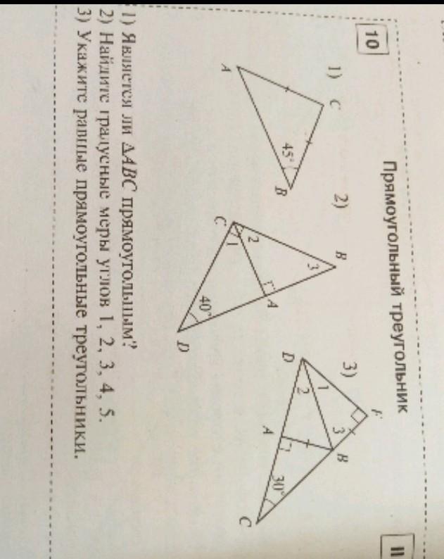 2) угол 1=50° (сумма острых углов при прямоугольном треугольнике); угол 2=50°(биссектриса); угол 3= 40° (сумма острых углов)