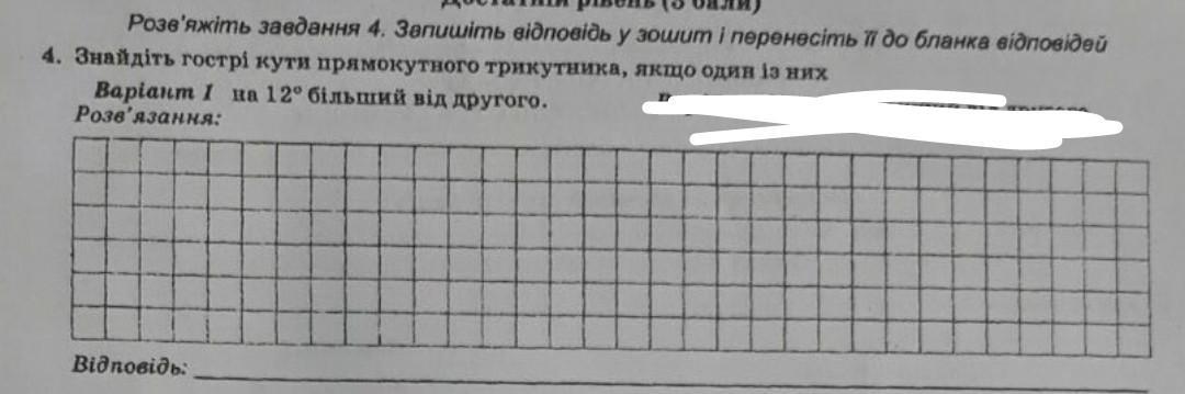 Знайдіть гострі кути прямокутного трикутника,якщо один із них на 12° більший від другого