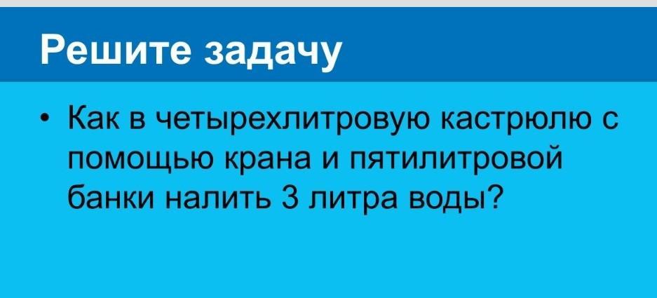 сначала набираешь 5литровую банку переливаешь в 4литровую, потом из 4литровой выливаешь, в 5литровой остаётся один литр, переливаешь его в 4 литровую, заново набераешь 5литровую переливаешь остаётся 2 литра, 4литровую выливаешь, из пяти литровой переливаешь, набираешь пяти литровую переливаешь остаётся 3литра из 4 литровой выливаешь и из пяти литровой переливаешь.