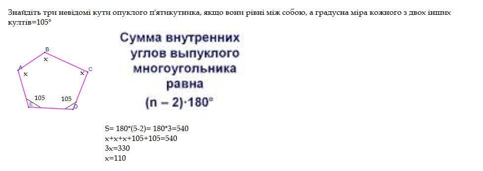 Знайдіть три невідомі кути опуклого п'ятикутника, якщо вони рівні між собою, а градусна міра кожного з двох інших култів=105°