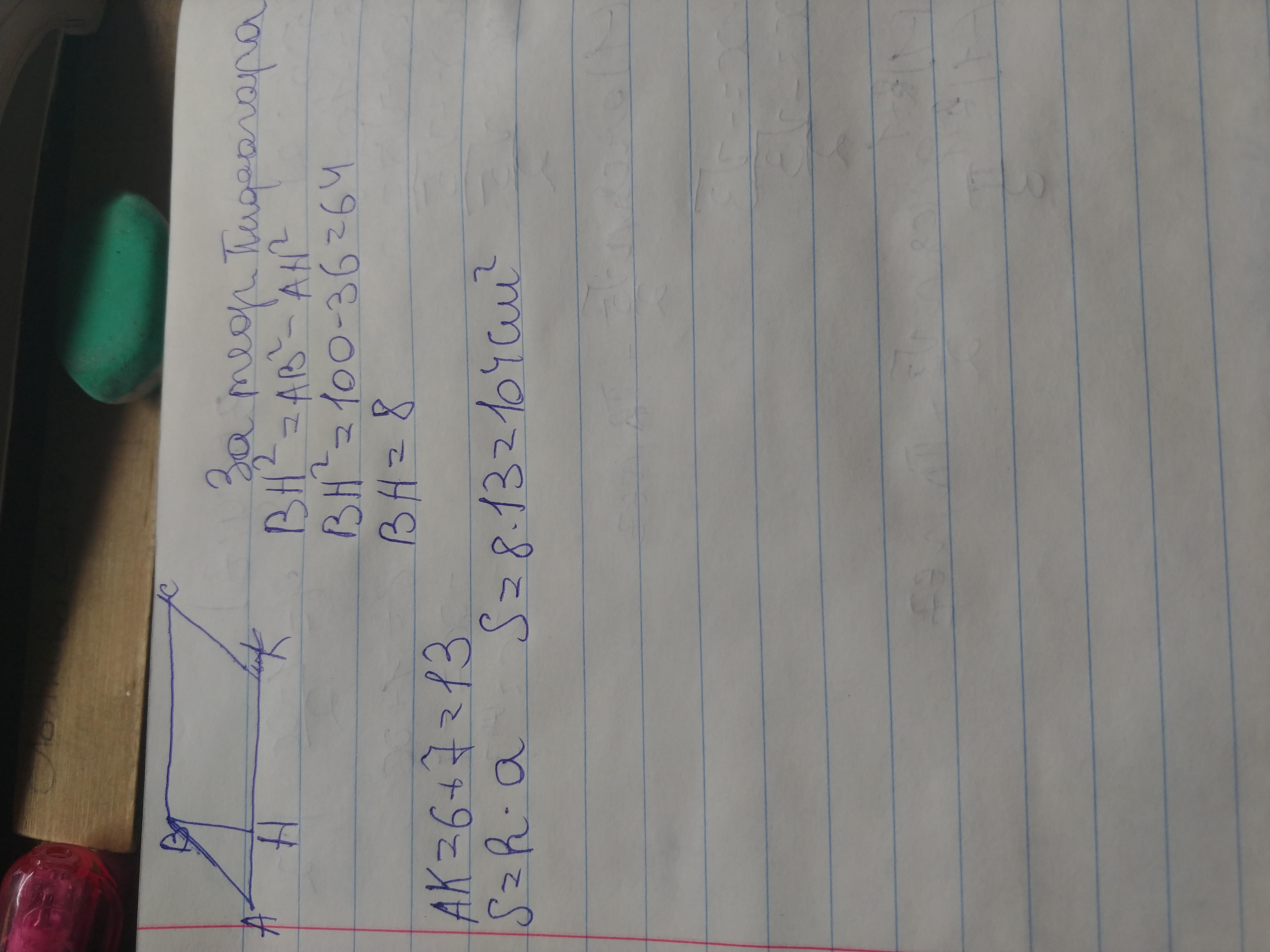 ВН² = 10² - 6² = 100 - 36 = 64