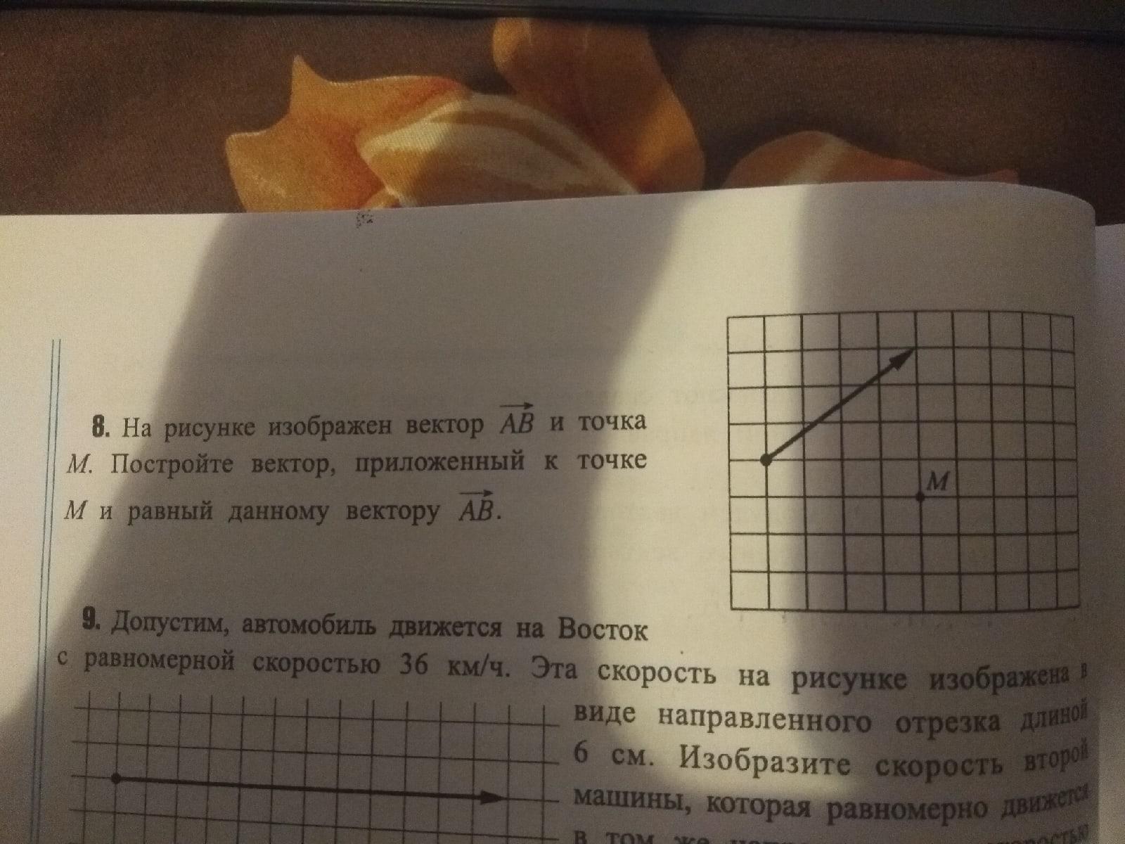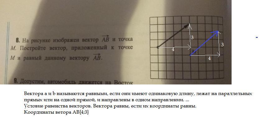на рисунке изображён вектор AB и точка M. Постройт вектор, приложенный к точке M и равный данному вектору AB