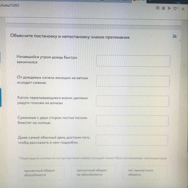 2. От дождевых капель, висящих на ветках, исходит сияние. (Причастный оборот обособляется)