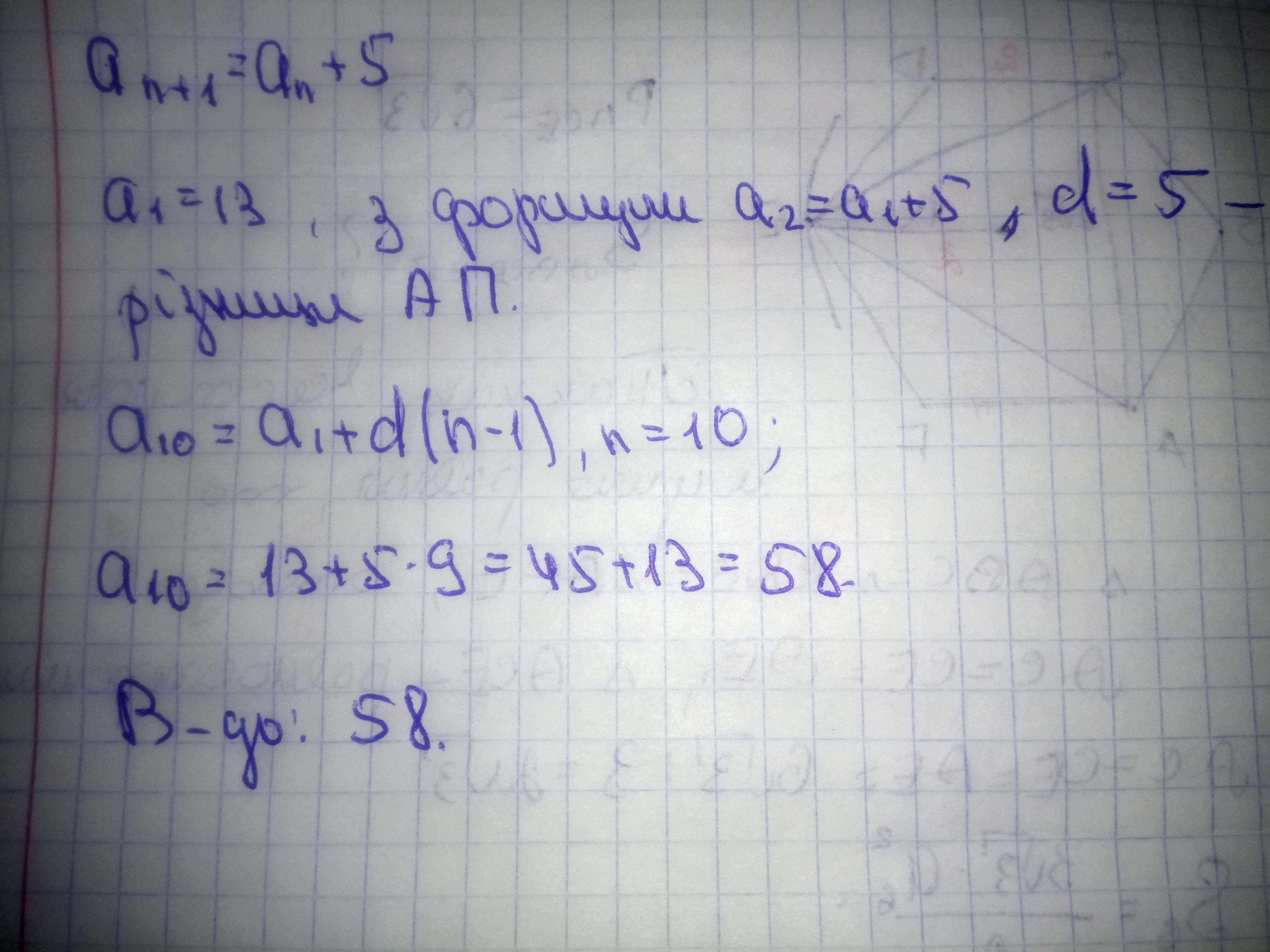 Дана арифметическая прогрессия (an). Задана формула n-го члена этой прогрессии и её первый член: an+1=an+5, a1=13. Найди десятый член данной прогрессии