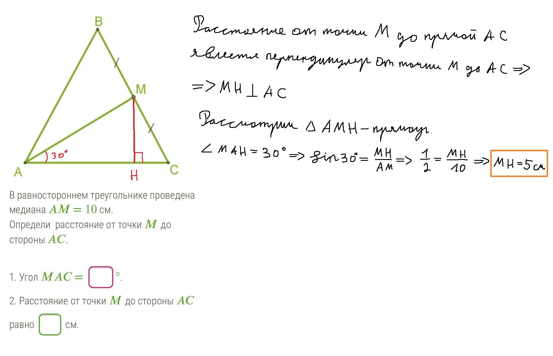 1) Угол МАС = 30 градусов, так как в равностороннем треугольнике АБС, АМ является не только медианной, но и биссектрисой этого треугольника. ( Все углы в равностороннем треугольнике равны по 60 градусов).