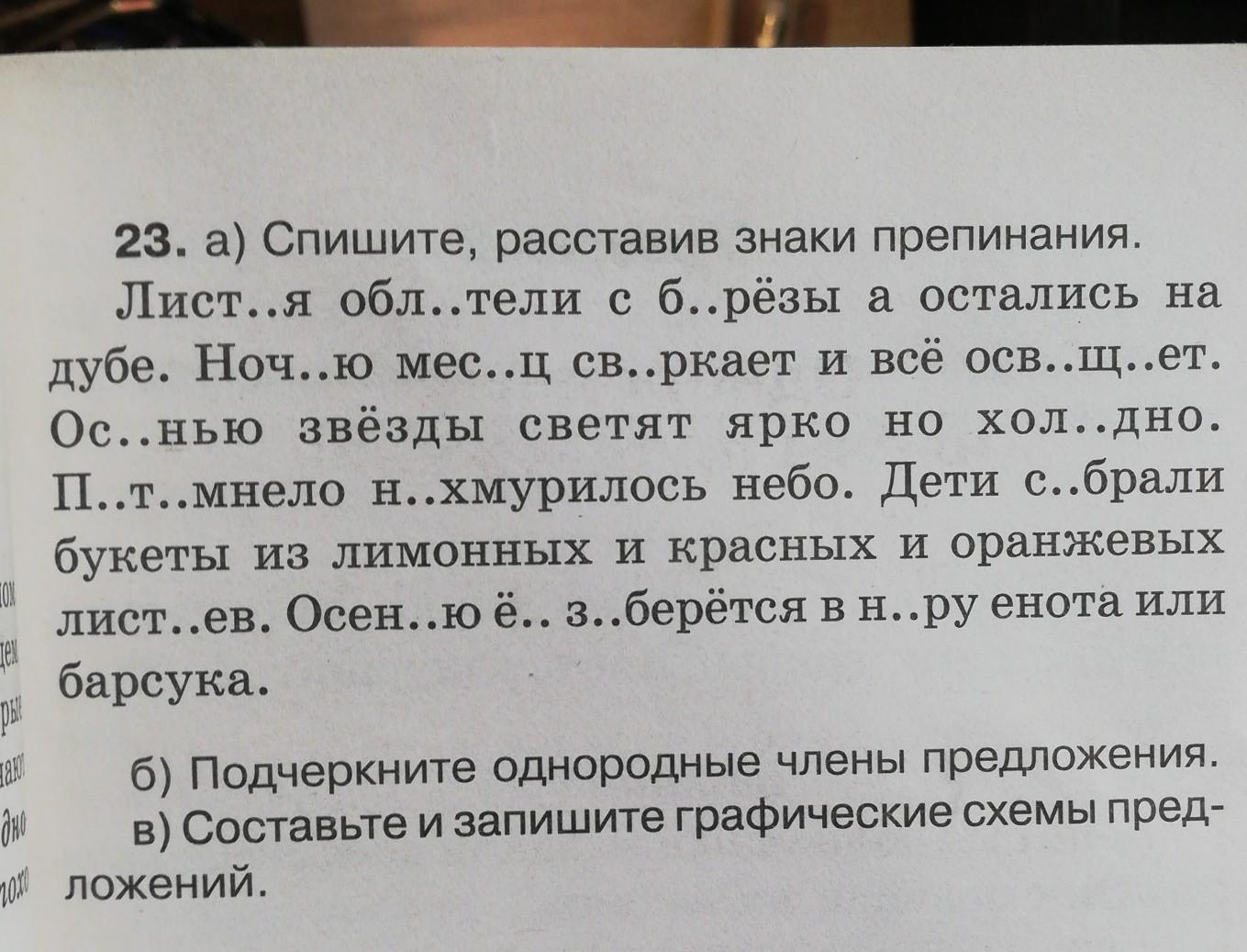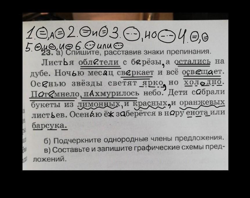в) (_ - подлежащее, = - сказуемое, ~ - прилагательное, () - обводка в кружок.)