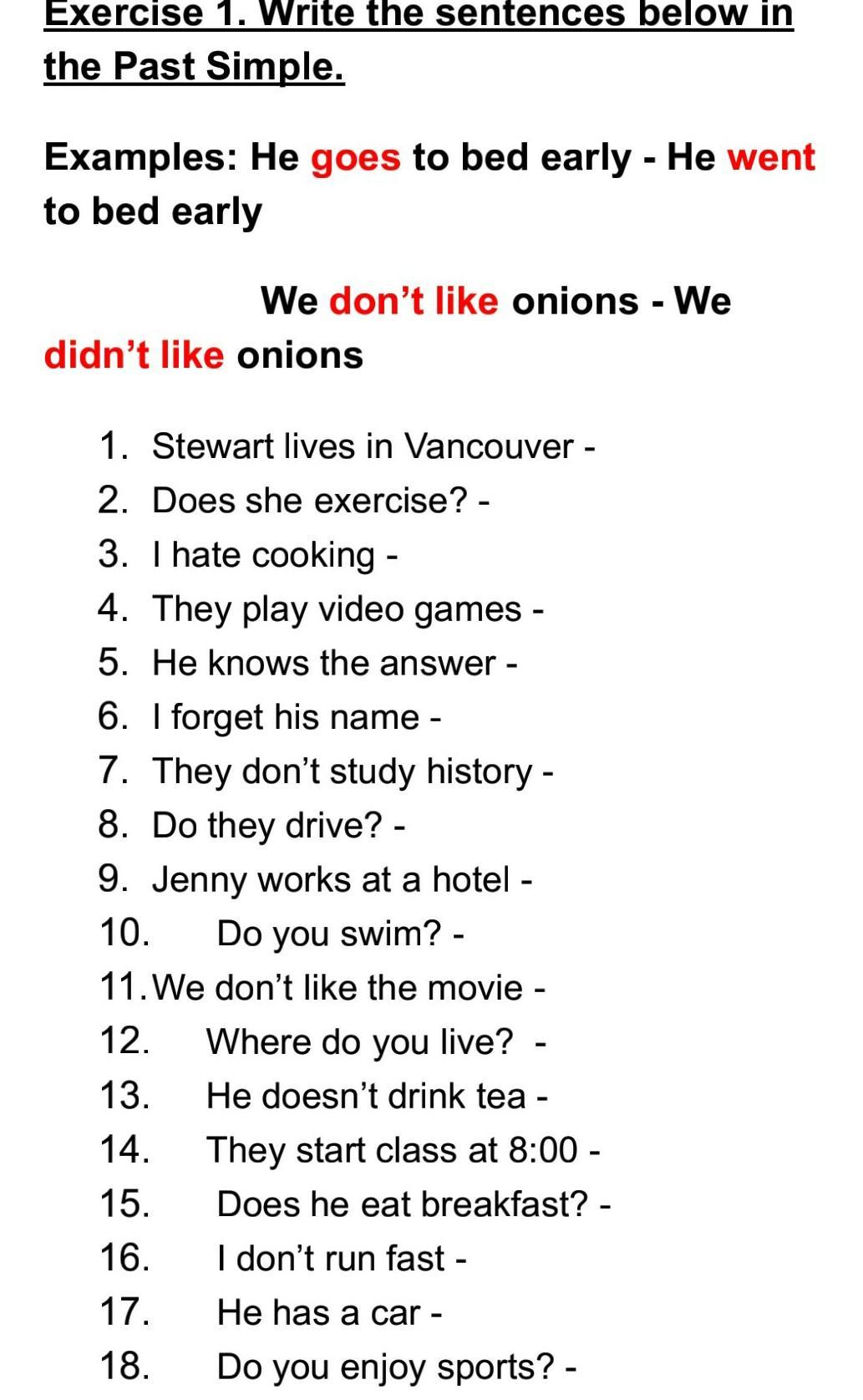 Exercise 1. Write the sentences below in the Past Simple.