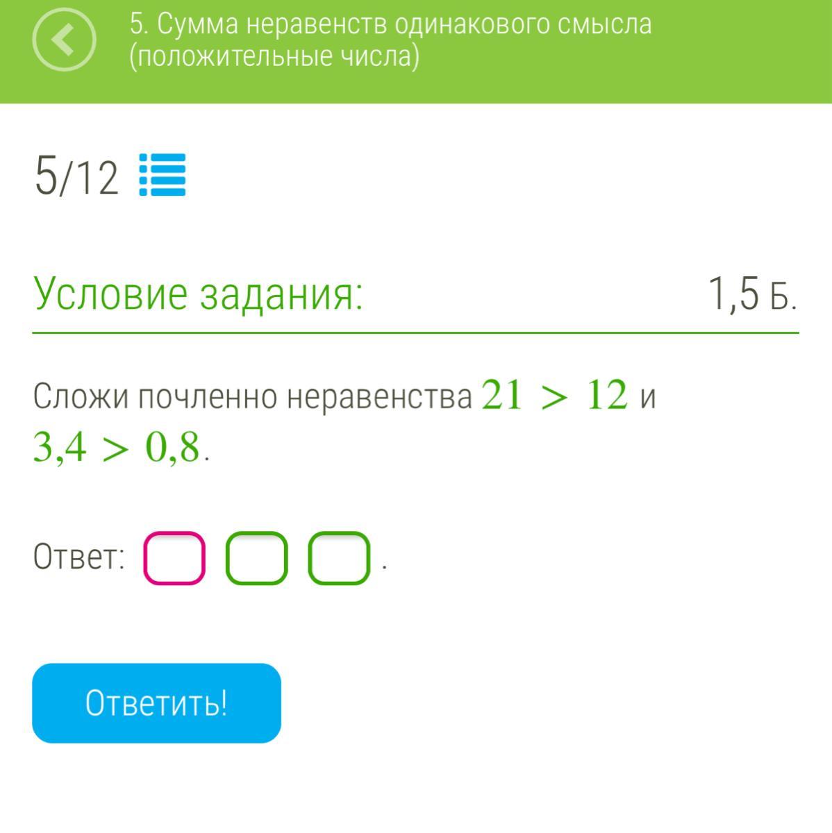 сначала складываешь 21 и 3,4 затем складываешь 12 и 0,8