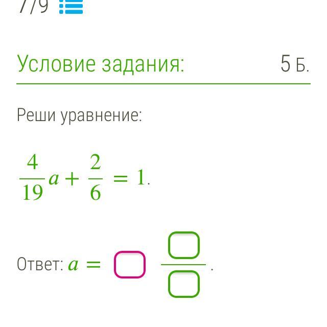 frac{4}{19} a + frac{2}{6} = 1\\frac{4}{19} a = 1-frac{1}{3} \\frac{4}{19} a = frac{2}{3} \\a = frac{2}{3} * frac{19}{4} = frac{19}{6}