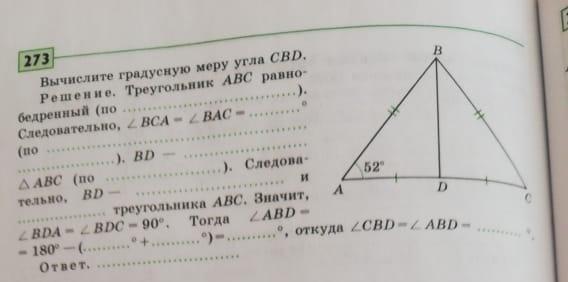 BD- медиана,ΔABC ( по условию). Cледовательно BD высота и биссектриса ΔABC . значит ∠BDA=∠BDC=90°.Тогда ∠ABD=180°-(90°+52°)=38°, откуда ∠CBD=∠ABD= 38°