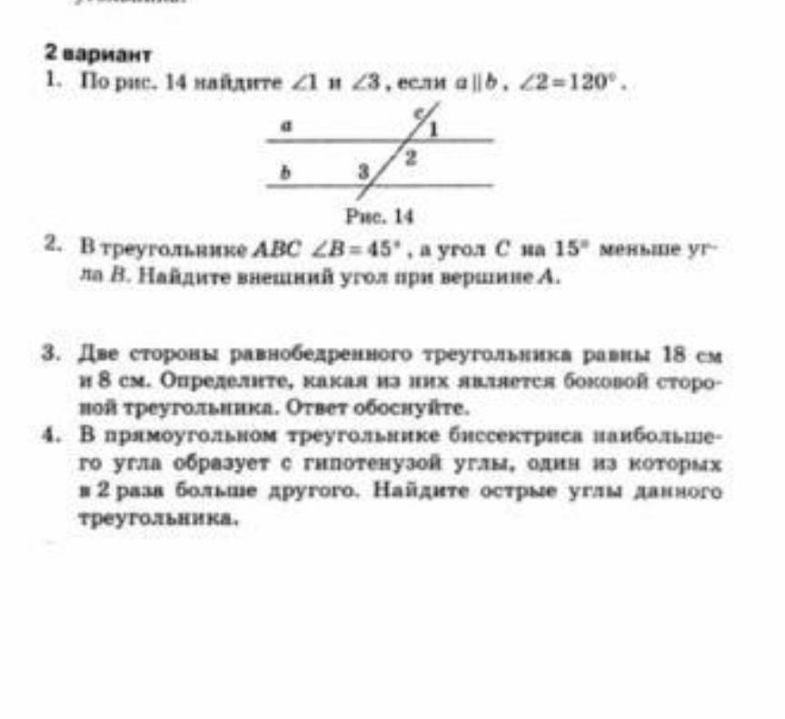 4)биссектриса образует смежные углы, их сумма = 180, значит по уравнению(х+2х=180), мы понимаем, что угол 1=60, а 2=120. Рассмотрим треугольник где угол 1: биссектриса делит угол 90 наполовину, т е по 45 градусов, а значит что неизвестный угол = 180-45-60=75 градусов, отсюда следует, что во всем прямоугольной треугольнике авс неизвестный оставшийся угол = 180-90-75= 15 градусов