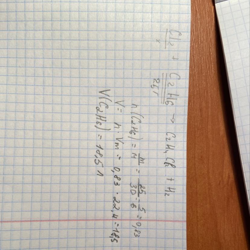 Какой объём хлора вступит в реакцию с этаном массой 25 г, если в реакции должен получиться хлорэтан ?