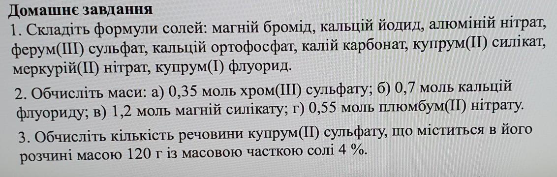 1) магній бромід MgBr2 , кальцій йодид KI, алюміній нітрат Al(NO3)3, ферум (III) сульфат Fe2(SO4)3, кальцій ортофосфат Ca3(PO4)2, калій карбонат K2CO3, купрум(II) силікат CuSiO3, меркурій (II) нітрат Hg(NO3)2, купрум (І) флуорид CuF.