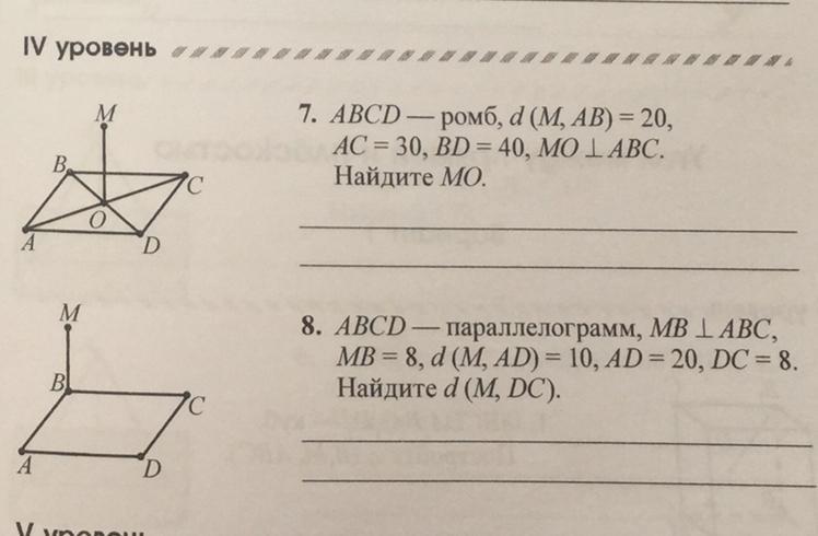 2. Проведем из точки В высоты на стороны АD И DС соответственно ВО и ВК. Тогда по теореме о трех перпендикулярах МО⊥АD, МК⊥DС, МО=10,ОВ=√(МО²-МВ²)=√(10²-8²)=6, Площадь параллелограмма равна АD*ВО=20*6=120, с др. стороны, площадь равна DС*ВК⇒ВК=2*60/8=15