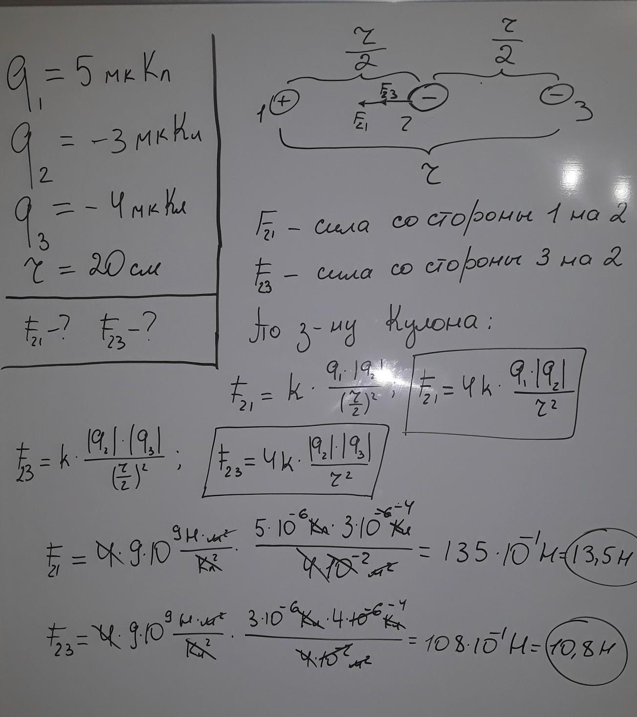 Заряди +5мкКл та -4 мкКл розміщені на відстані 20см один від одного. Знайти силу, з якою діють заряди на заряд -3 мкКл, поміщений посередині лінії, що сполучає ці зарядиЗаряди +5мкКл та -4 мкКл розміщені на відстані 20см один від одного. Знайти силу, з якою діють заряди на заряд -3 мкКл, поміщений посередині лінії, що сполучає ці заряди