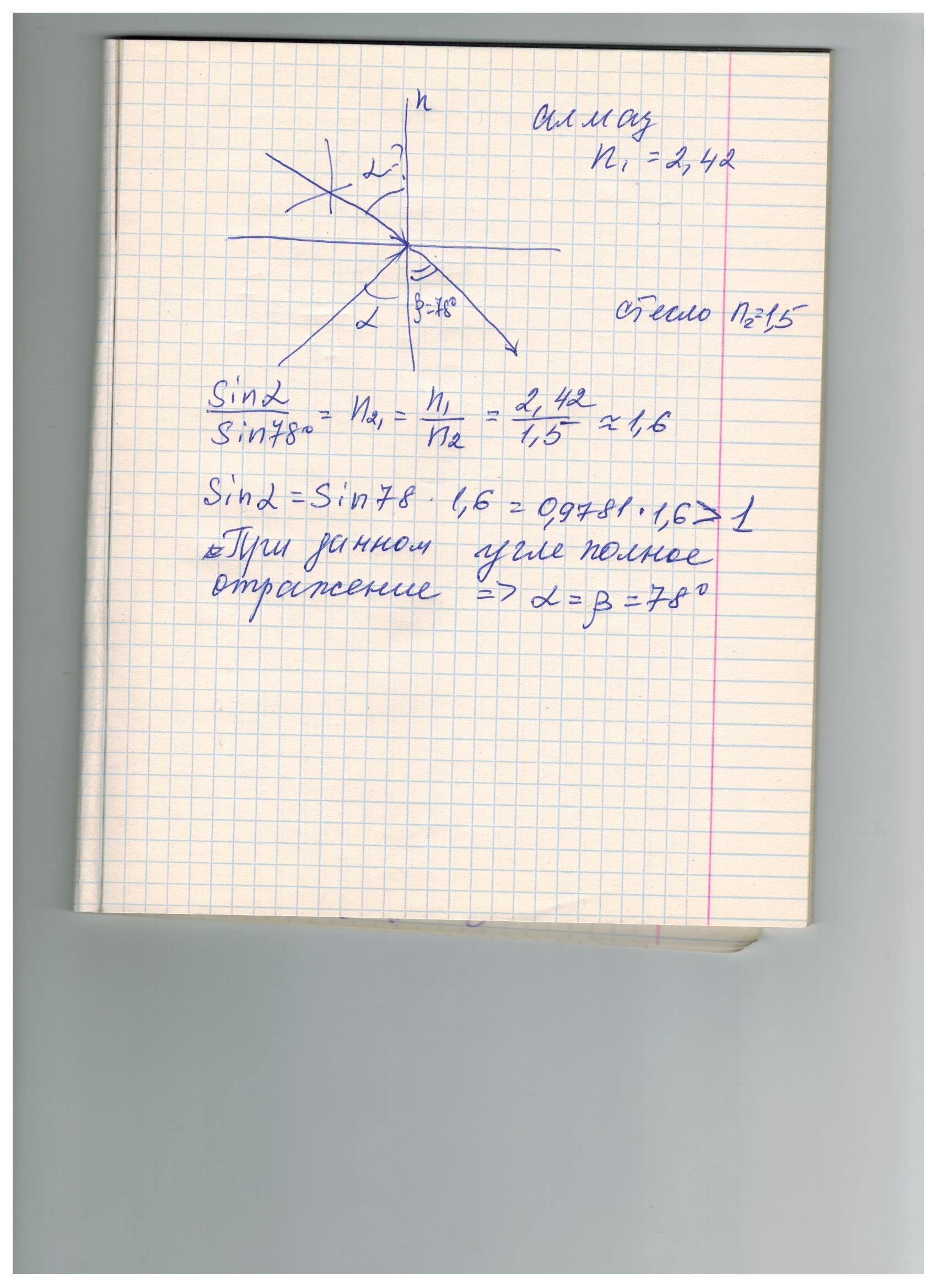 преломления равен 780 и световой луч переходит из алмаза в стекло, с решением можно))