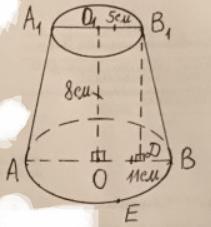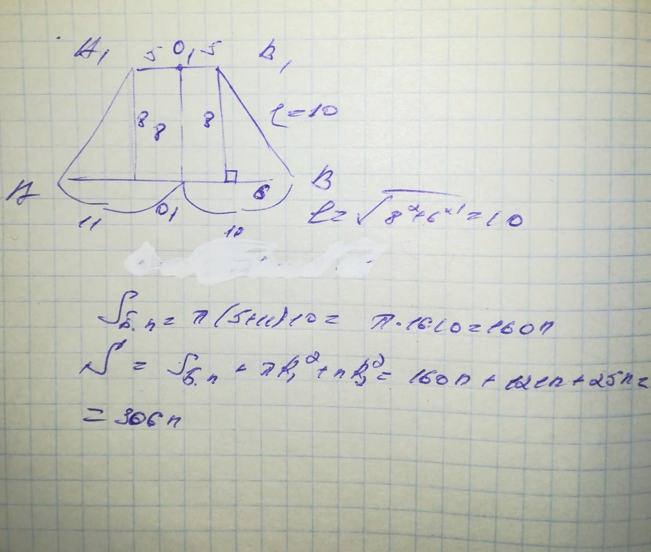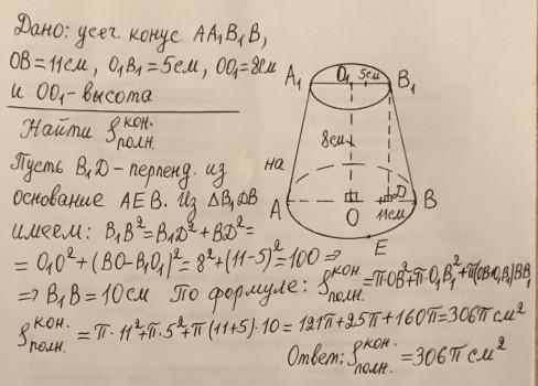 Радиусы оснований усеченного конуса 5 см и 11 см, высота 8 см. Найти площади боковой и полной поверхности усеченного конуса