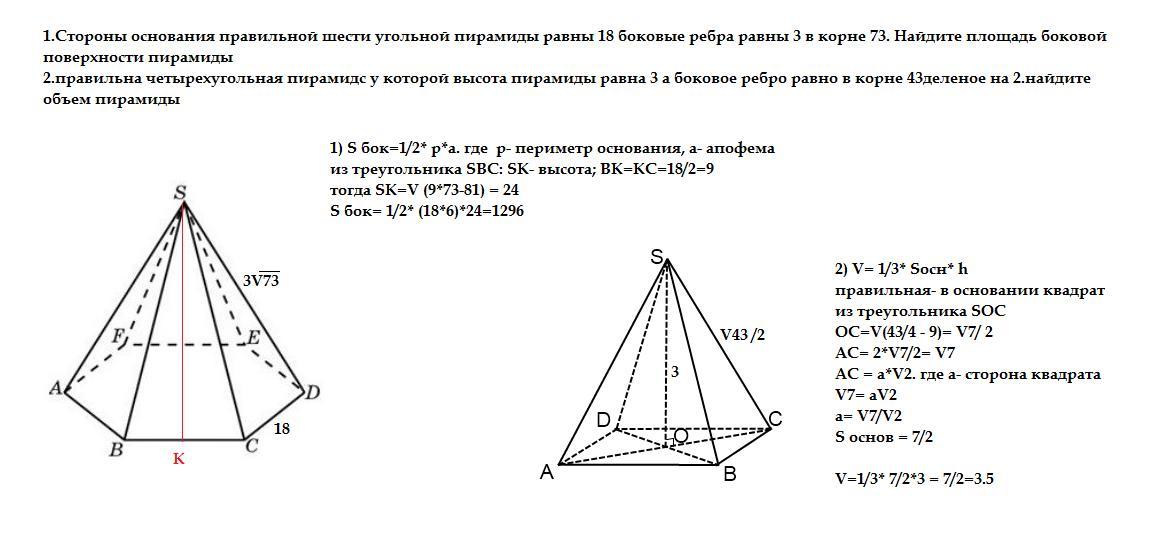 1.Стороны основания правильной шести угольной пирамиды равны 18 боковые ребра равны 3 в корне 73. Найдите площадь боковой поверхности пирамиды