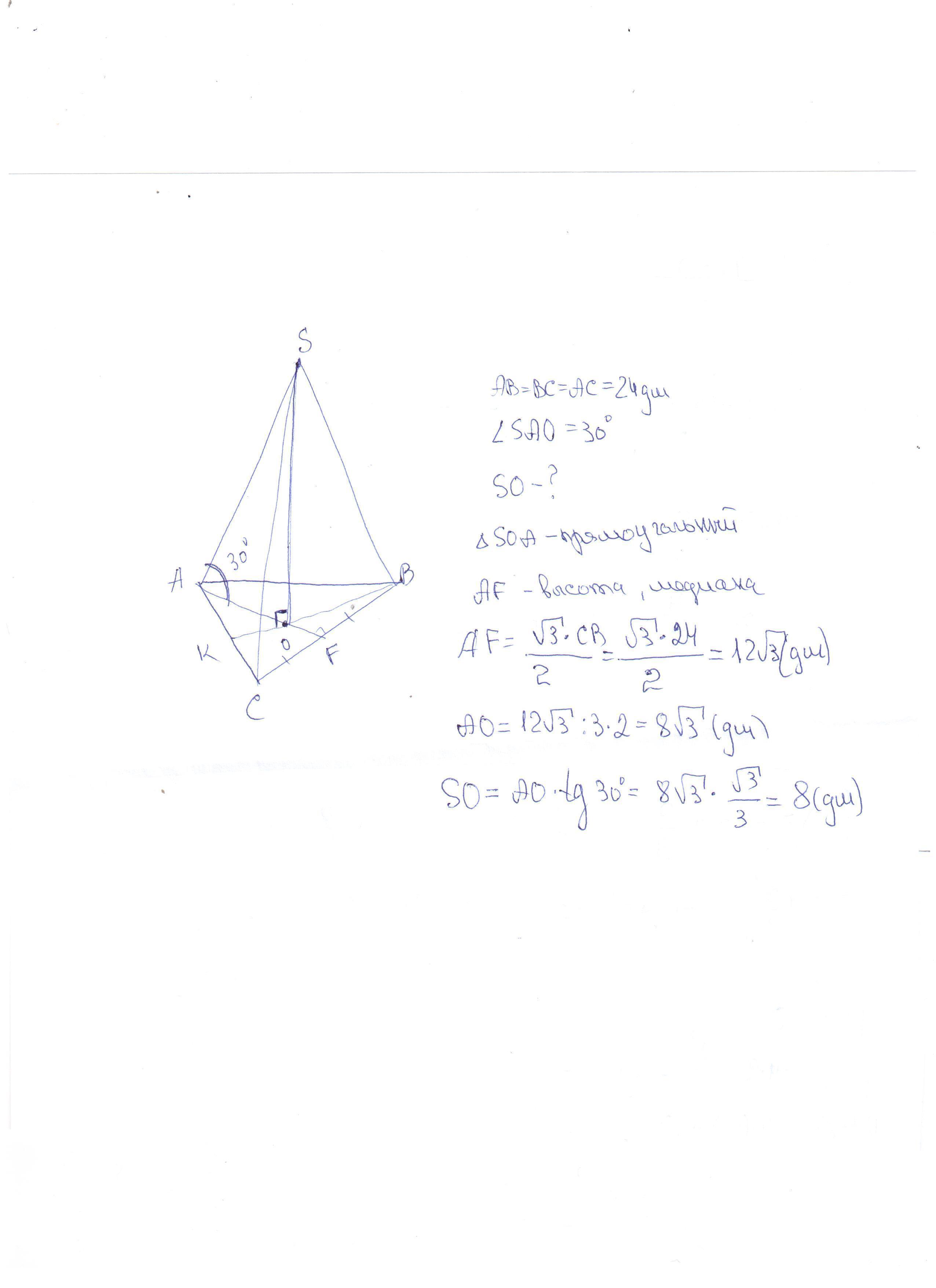 Сторона основания правильной треугольной пирамиды равна 24 дм, боковое ребро с плоскостью основания образует угол 30°.