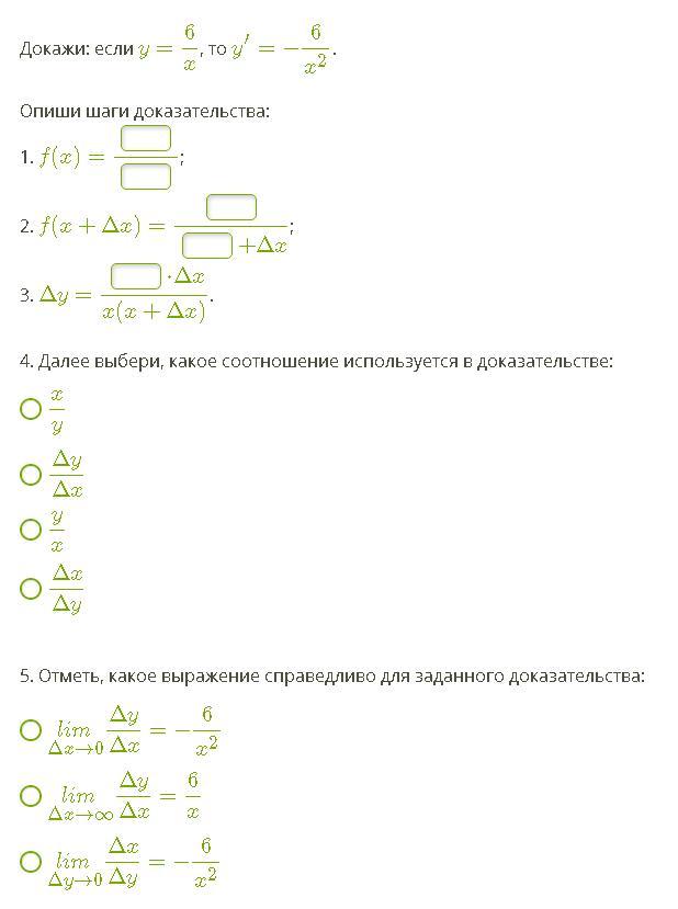 f(x) = frac6x\f(x + Delta x) = frac{6}{x+Delta x}\Delta y = f(x + Delta x) - f(x) = frac{6}{x+ Delta x} - frac6x = frac{6x - 6x - 6Delta x}{x(x + Delta x)} = frac{-6Delta x}{x(x + Delta x)}\\frac{Delta y}{Delta x} = frac{-6}{x^2 + Delta x cdot x}\\limlimits_{Delta xto0}frac{Delta y}{Delta x} = limlimits_{Delta xto0}frac{-6}{x^2 + underbrace{Delta xcdot x}_{to0}} = -frac{6}{x^2}