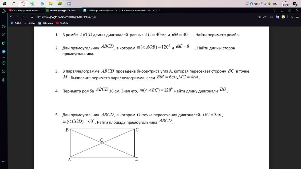 АО = ОС = ОВ = ОD (диагонали прямоугольника точкой пересечения делятся пополам)