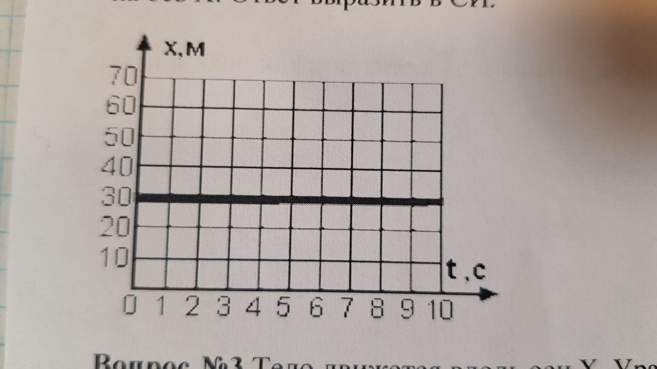 По графику видно, что в любой данный на рассмотрение момент времени координата тела по оси Ох неизменна (и равна 30 м), значит тело по этой оси не двигается и проекция его скорости на эту ось равна нулю. Это подкрепляется ещё и известными уравнениями координаты при РПерД (равнопеременном/ равноускоренном) или же при РПД (равномерном прямолинейном движении), соответственно х = х0 (в данной задаче 30м) + Voх*∆t + ax*∆t^2 / 2 или х = х0 + Vоx * ∆t, ведь если бы ах или Vox не были бы равны нулю, х изменялась бы со временем (т.е. при промежутке времени, не равном нулю), но согласно графику х = 30 м при 10 ≥ t > 0. А проекция скорости – Vx – вычисляется как раз таки как сумма Vox и a*∆t (при РПерД) и как произведение Vx*∆t (при РПД), так что Vx = 0 м/с.