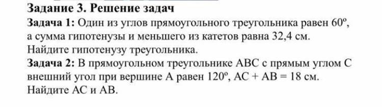 1. Меньший катет лежит против меньшего угла в 30°(сумма острых углов в прямоугольном треугольнике равна 90°, 90°-60°=30°), поэтому в два раза меньше гипотенузы, если он равен х, то гипотенуза 2х; х+2х=32.4