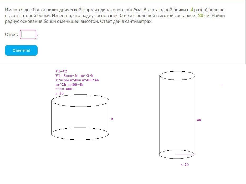 V₁ =V ₂ ⇔ πR²*h = πr²*H ⇔ (R/r)² =(H/h) ⇒ R = r√(H/h)