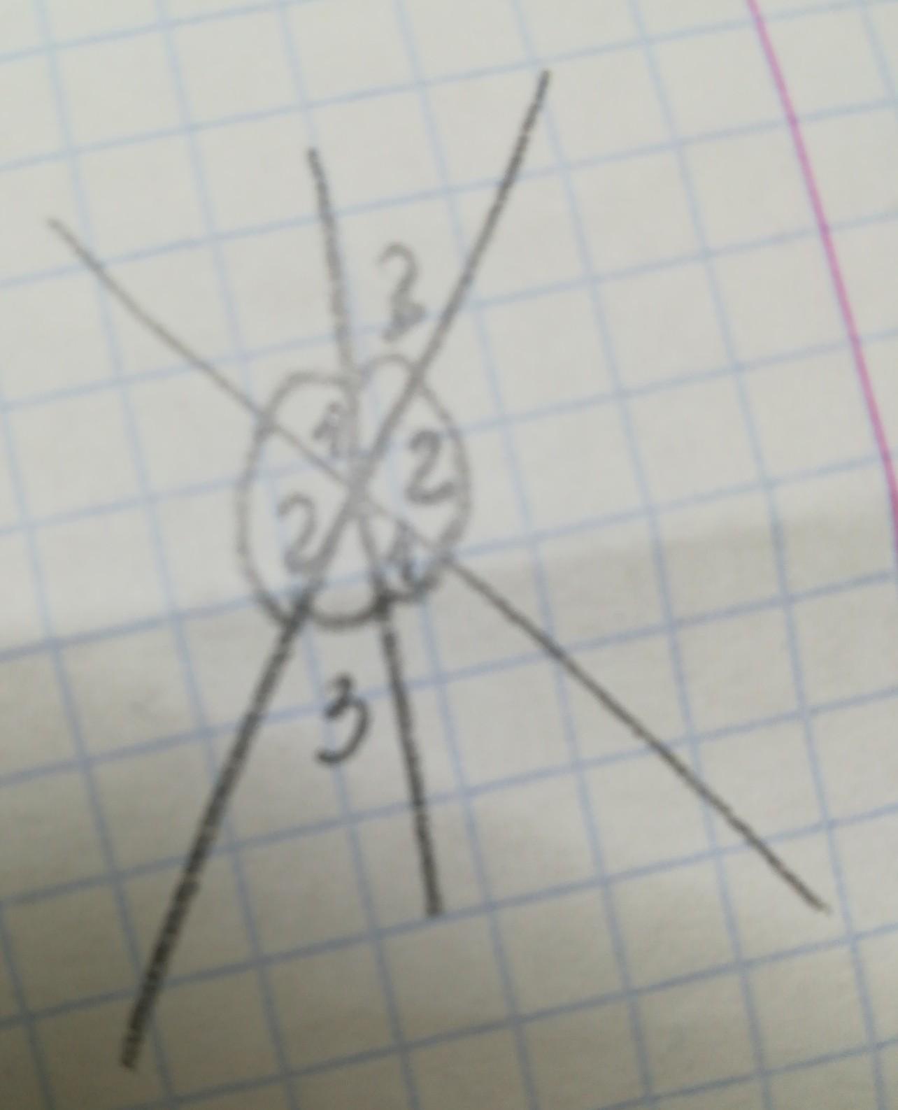 Ну смотри, вертикальные углы — пара углов, у которых вершина общая, а стороны одного угла составляют продолжение сторон другого угла. То есть сдесь их 3 пары