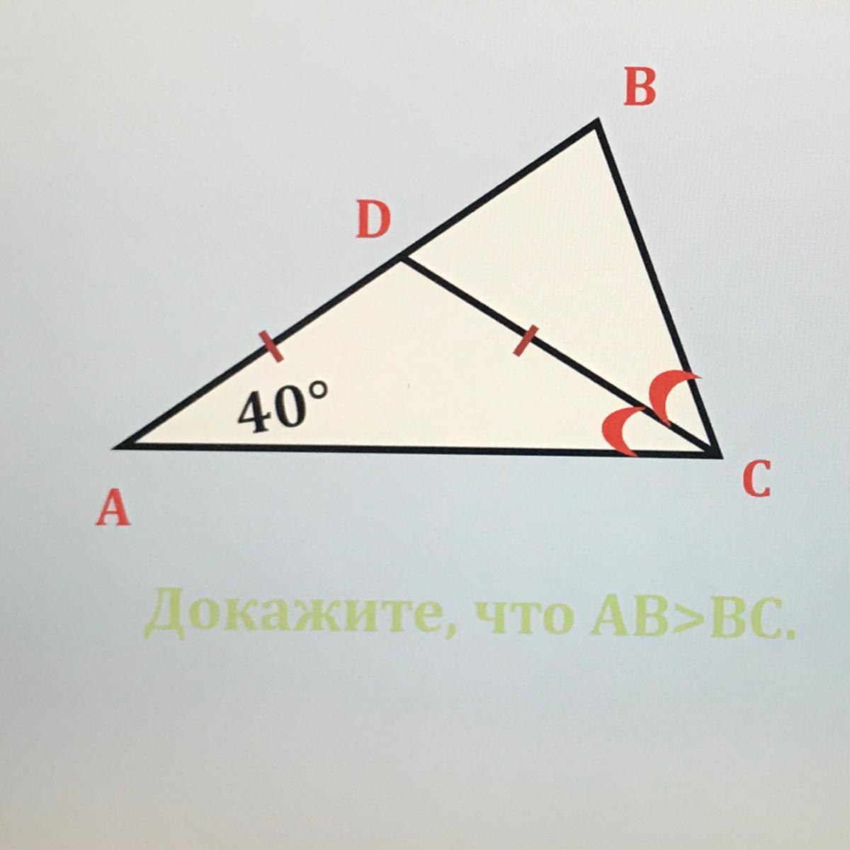 Треугольник ADC - равнобедренный, тогда угол ДСА =ВСД=40 , АВС=80 (40+40).Против большего угла лежит большая сторона. 80>40( ДС мысленно убираем). Вопросы , задавай