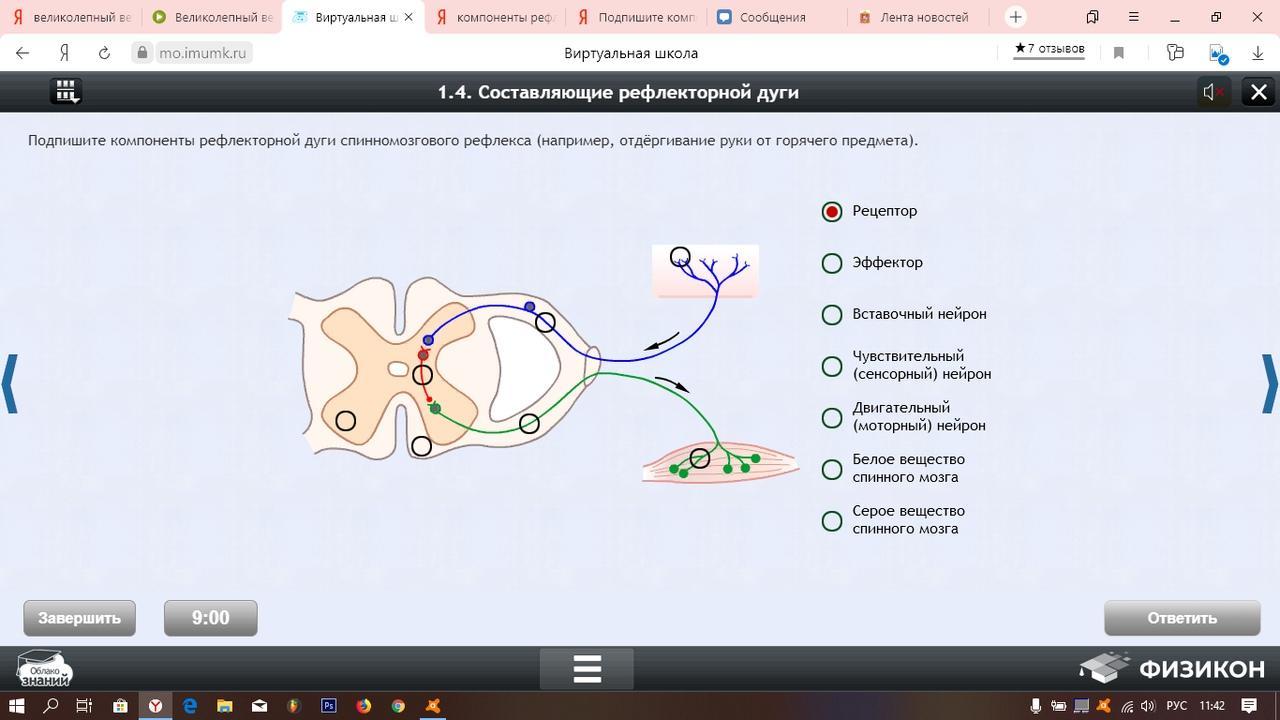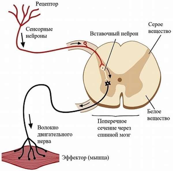 Подпишите компоненты рефлекторной дуги спинномозгового рефлекса (например, отдёргивание руки от горячего предмета).