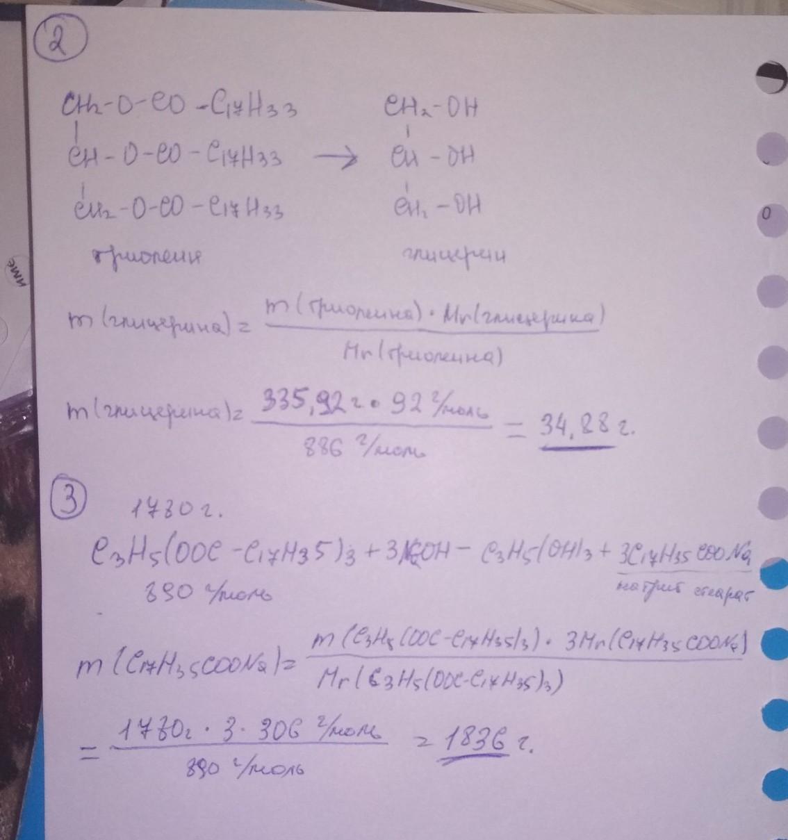 2. Вычислите массу глицерина, образующегося при омыления триоле- нового жира массой 335,92г.