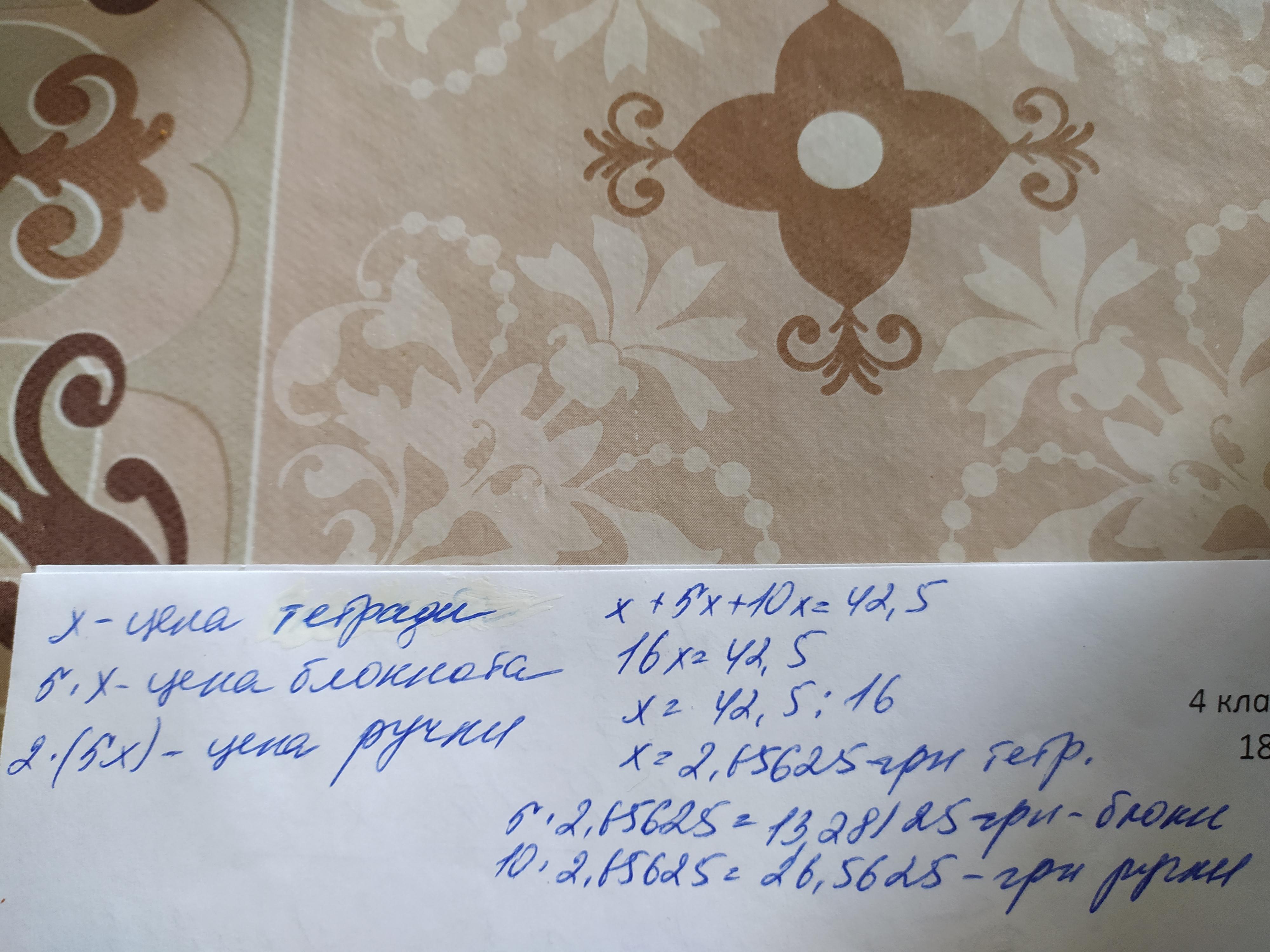 Ответ: пусть тетрадь стоит х, тогда 5*х+х+10*х=42,5⇒16*х=42,5⇒х=42,5/16≈2,66 грн - стоимость тетради. Блокнот стоит 5*2,66=13,3 грн, ручка стоит 2,66*10=26,6 грн.