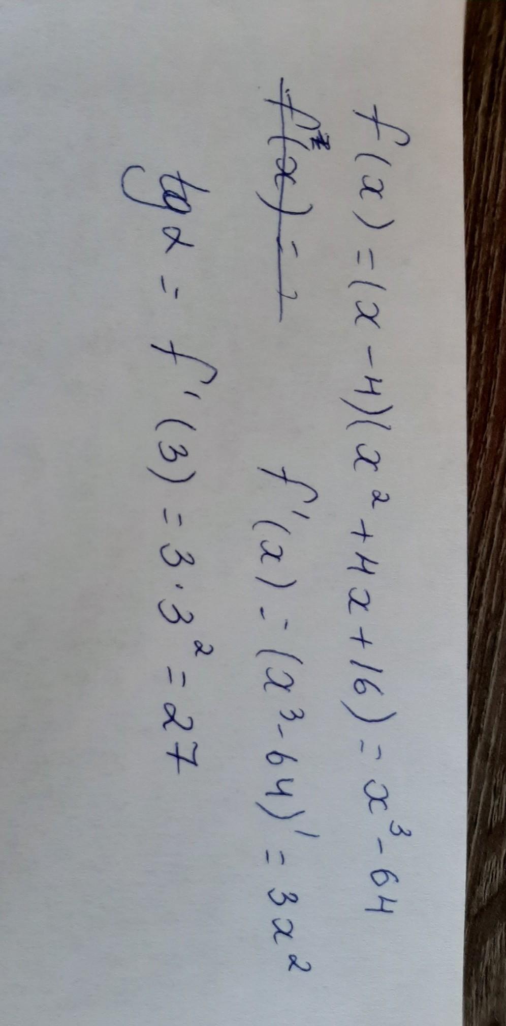 Вычисли тангенс угла наклона касательной, проведённой к графику функции f(x)=(x−4)(x2+4x+16) в точке с абсциссой x0=3.