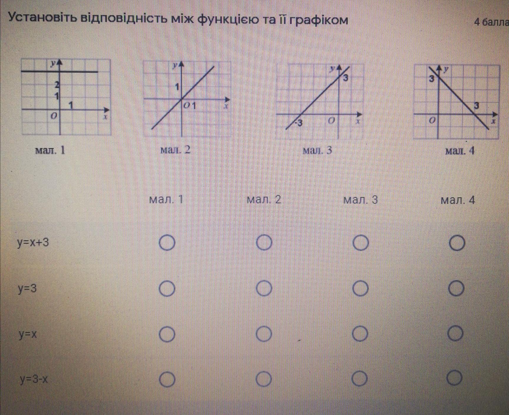 Объяснение:мал 1 у=3 мал 2 у=х мал 3 у= х+3 мал 4 у= 3-х