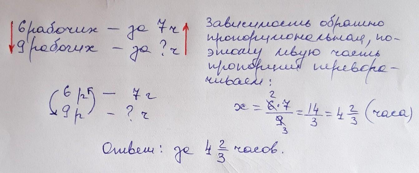 Шестеро рабочих выполняют работу за 7 часов. Сколько времени понадобится 9 рабочим чтобы выполнить ту же работу?