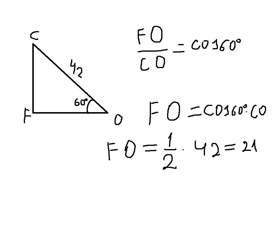 Срочно! У прямокутному трикутнику CFO гіпотенуза СО дорівнює 42 см, угол О=60°. Знайдіть катет FO.