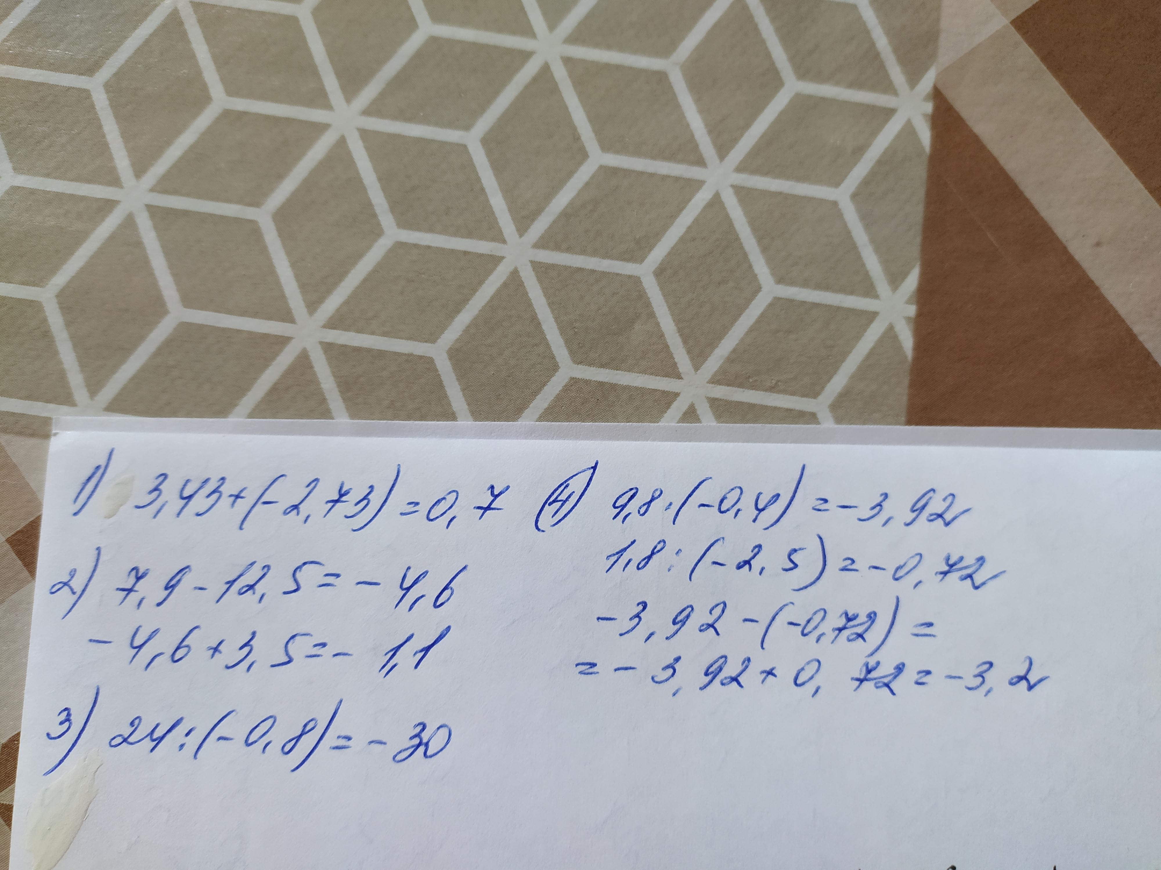 Помогите пожалуйста. 1.Заполните пропуск (....)+(-2,73)=0,7 1)3,43, 2)2,03, 3)-2,03 2.Выполнить действия:(7,9-12,5)+3,5; 1)-1,1; 2)-,4; 3)-3,1; 3.Выполните деление:24:(-0,8); 1)30 : 2)-72; 3)-30 4.вычислите: 9,8*(-0,4)-1,8:(-2,5) 1)3,2; 2)4,64; 3)-3,2