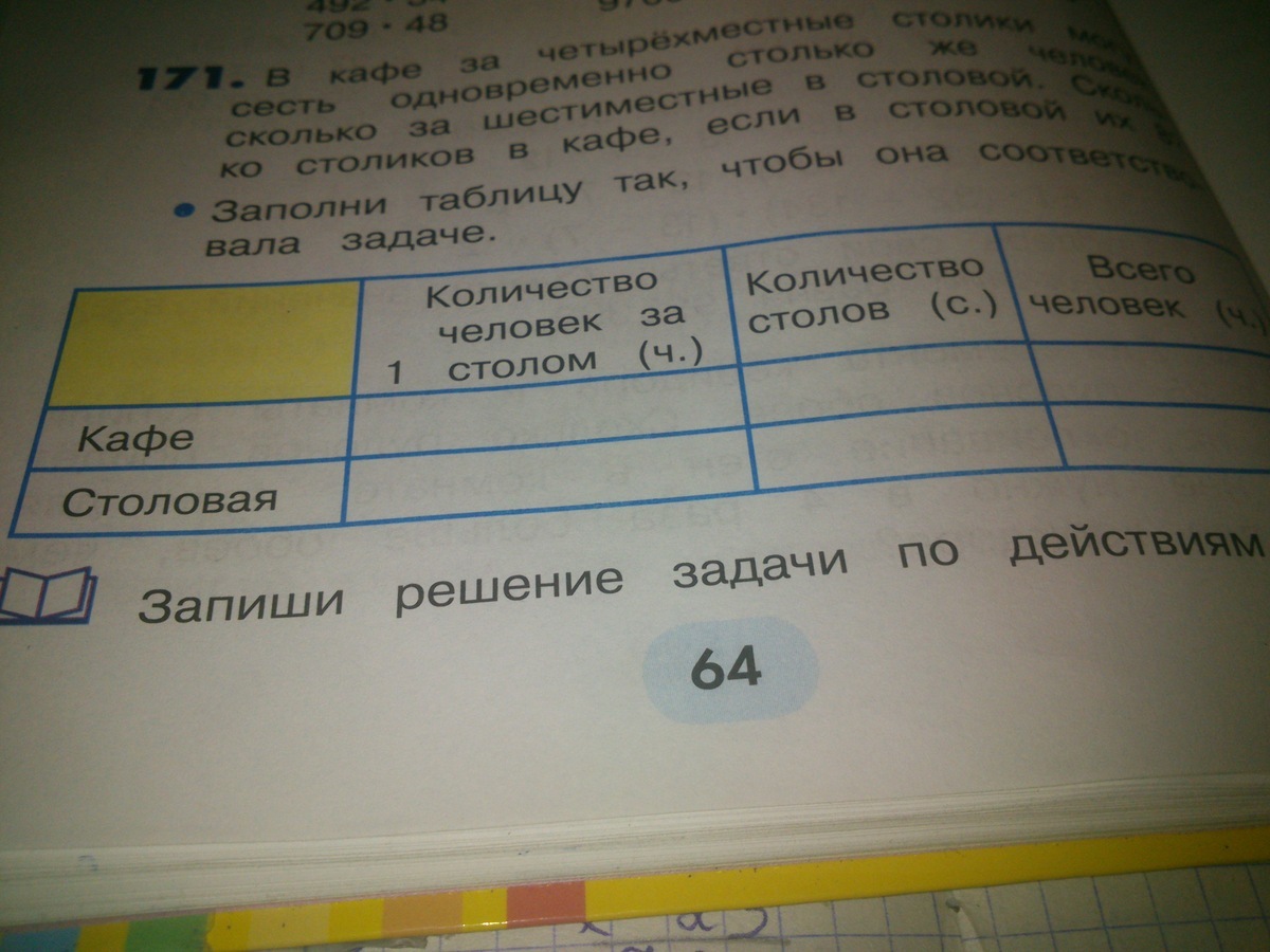 помогите с задачой! В кафе за четырехместные столики могут сесть одновременно столько же человек, сколько за шестиместные в столовой. Сколько за столиков а кафе, если в столовой их 8? помогите в этом задаче есть и табличка помогите пожалуйста!