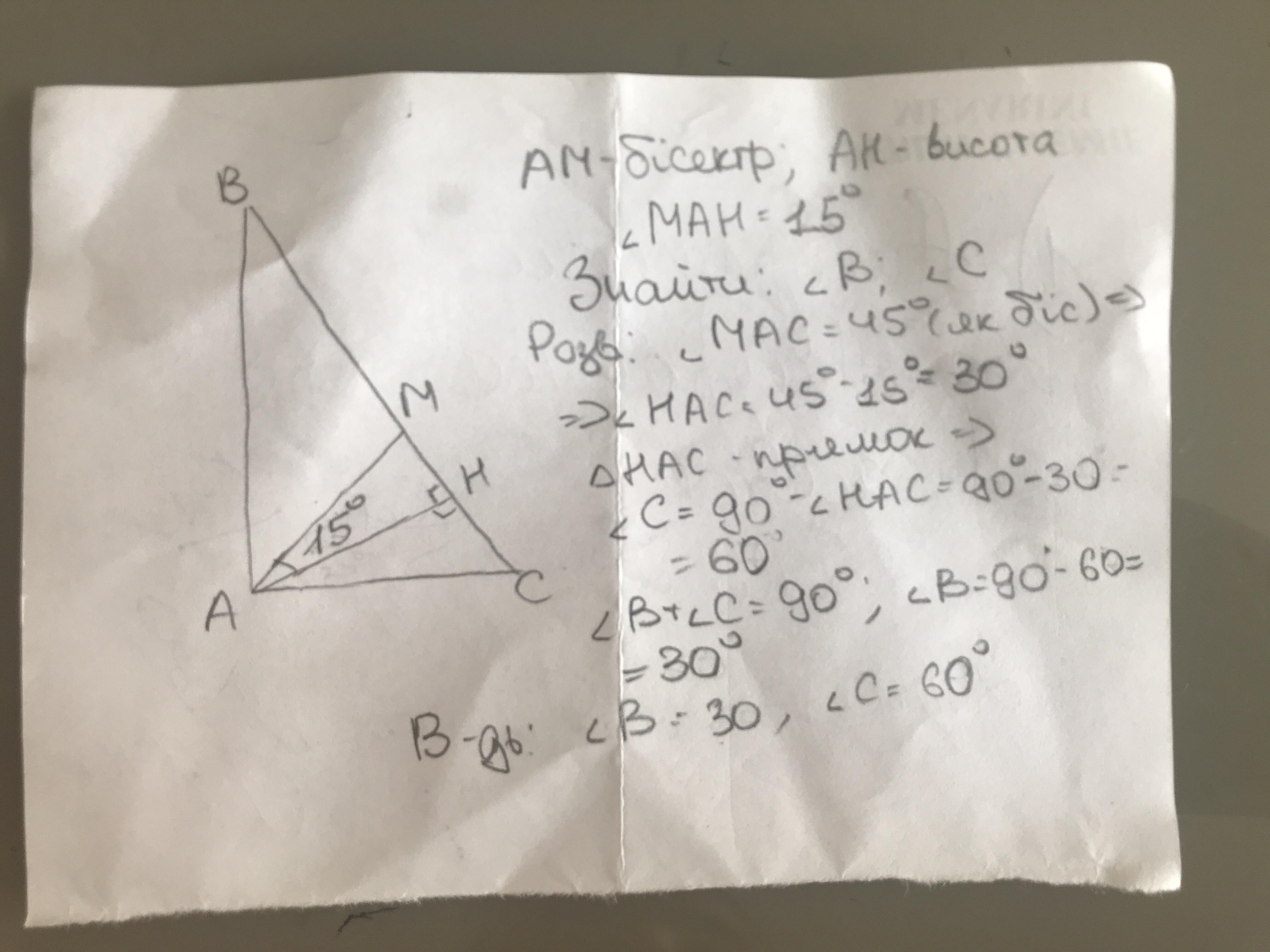 З вершини найбільшого кута прямокутного трикутника проведені бісектриса і висота кут мід якими дорівнює 15 градусів. Знайти гострі кути трикутника
