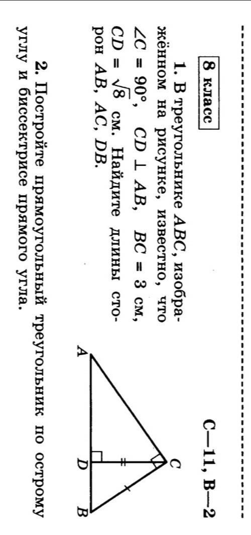 Задача: В треугольнике ABC известно, что ∠C = 90°, CD⊥AB, BC = 3 см, CD = √8 см. Найти длины сторон AB, AC, DB.