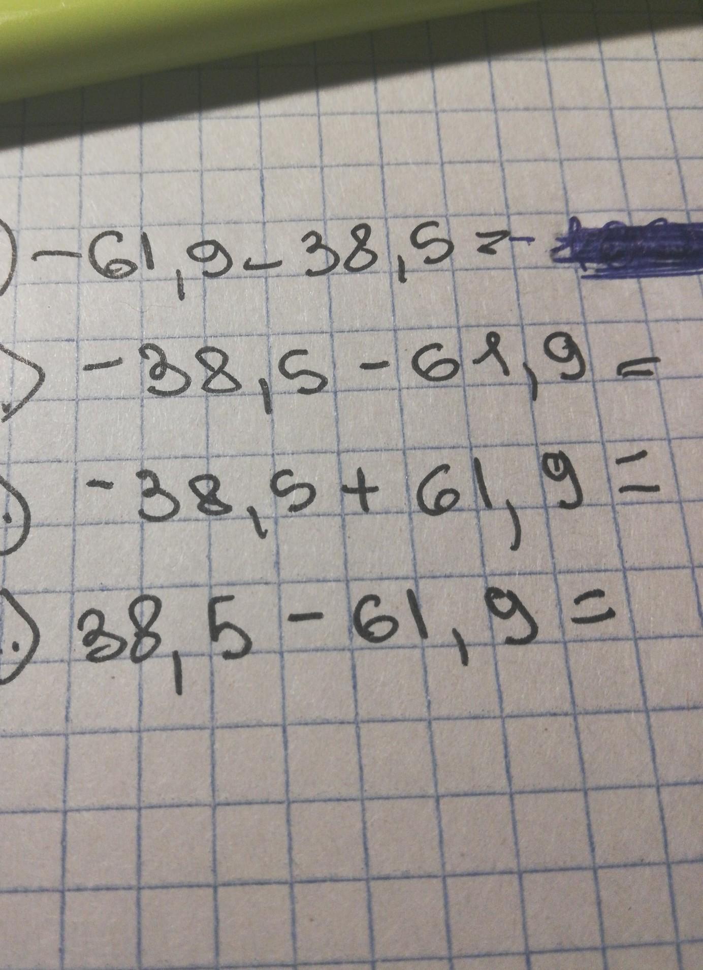 1);-61.9-38.5=-(61.9+38.5)=-100.4\2);-38.5-61.9=-(38.5+61.9)=-100.4\3);-38.5+61.9=+(61.9-38.5)=23.4\4);38.5-61.9=-(61.9-38.5)=-23.4